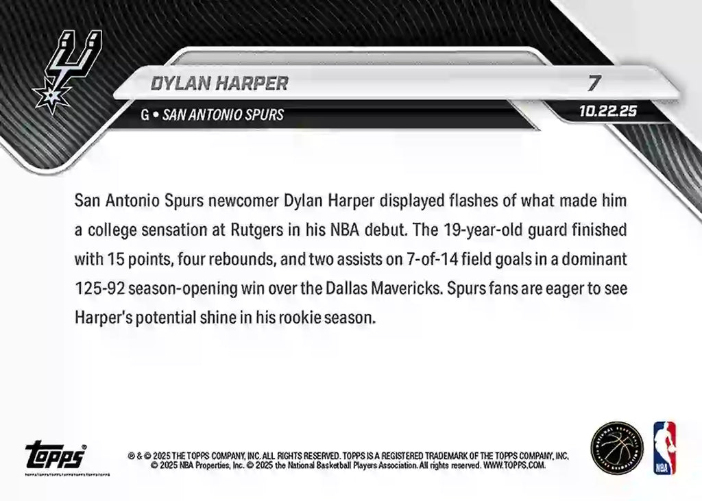 Dylan Harper - 2025-26 NBA Topps NOW - Card 007, disponible en World Trading Cards.