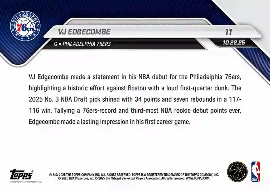 VJ Edgecombe - 2025-26 NBA Topps NOW - Card 011, disponible en World Trading Cards.
